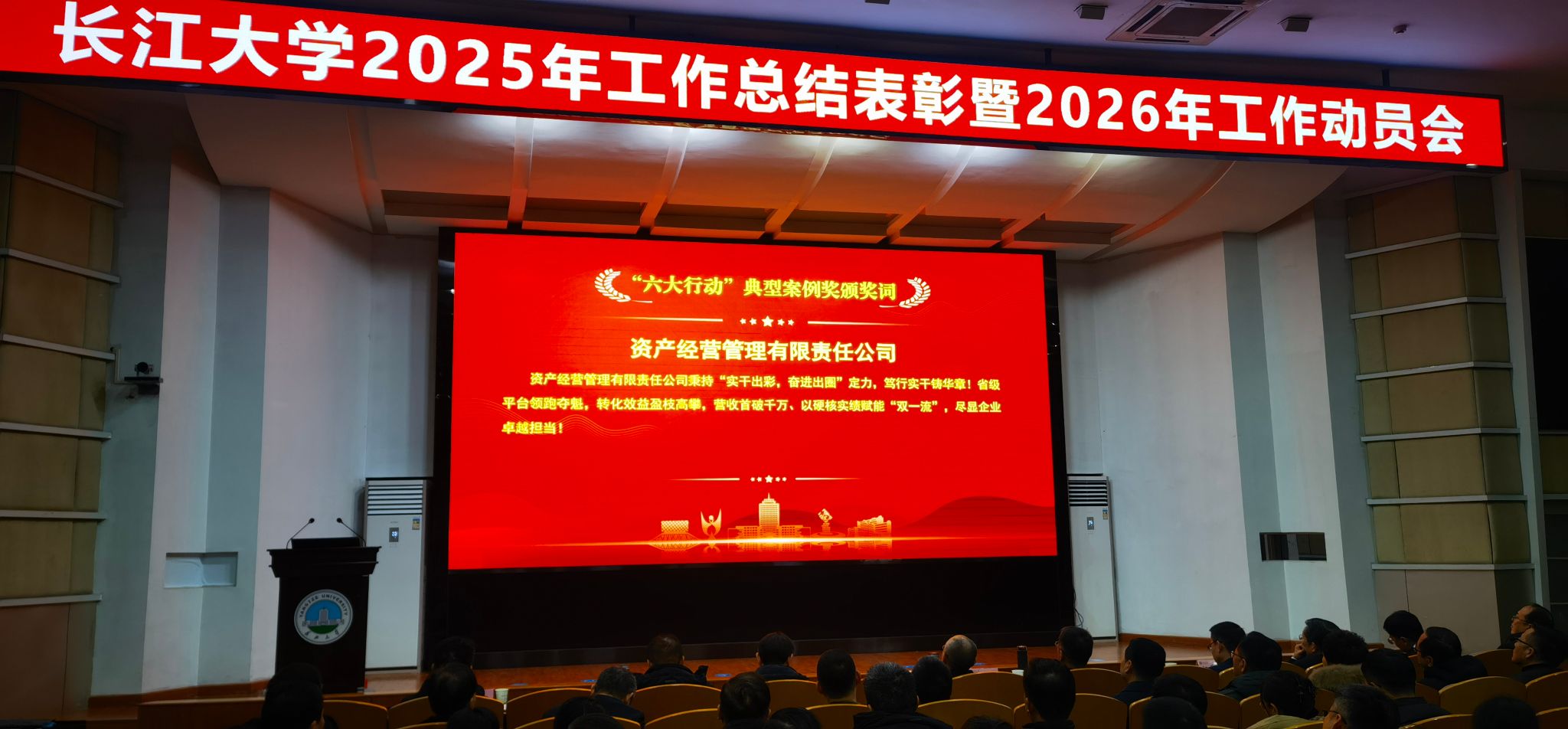 (通讯员:刘佑)1月25日,长江大学2025年工作总结表彰暨2026年工作动员会在求实报告厅隆重举行。大会对过去一年在学校各项事业发展中表现突出的集体与个人进行了表彰,资产公司凭借其卓越的业绩与显著的贡献,荣获“六大行动”典型案例奖。资产公司总经理刘金科代表公司领奖。